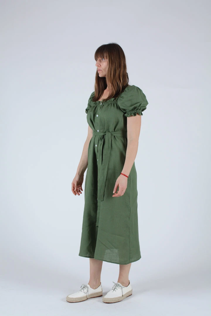 Shortsleeved easy button front lounge dress. Sleeves and square neckline are fixed with a soft elastic band.  Comes with a matching belt.