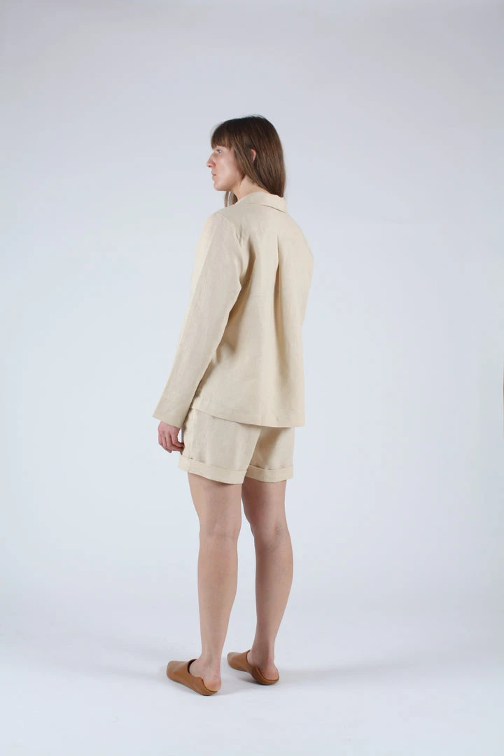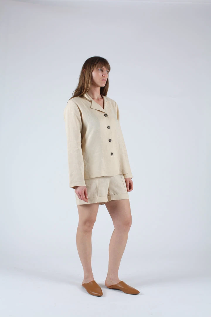 A feminine take on utilitarian classic menswear pajamas. Four-button notched collar top. Drawstring adjustable shorts with side pockets.