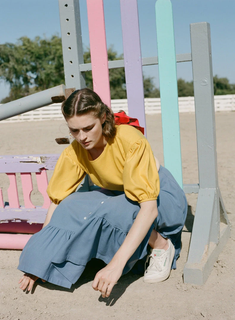 High waist, flared circle skirt with ruffled hem in sunflower yellow. Mother of pearl buttons along center front, inseam side pockets.