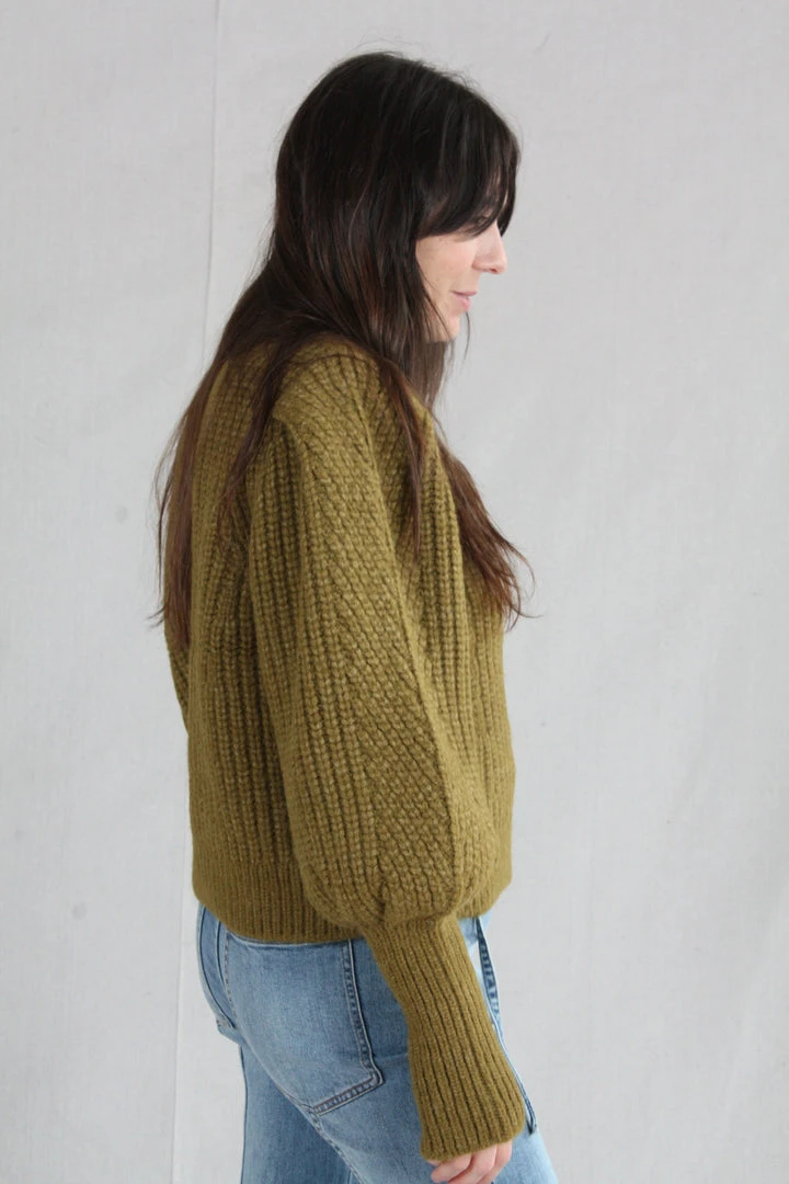 The Alana Pullover is knitted in a lofty alpaca wool, in a deep shade of Tapenade. Features billowing sleeves with a slim, elongated cuff and a high turtleneck.