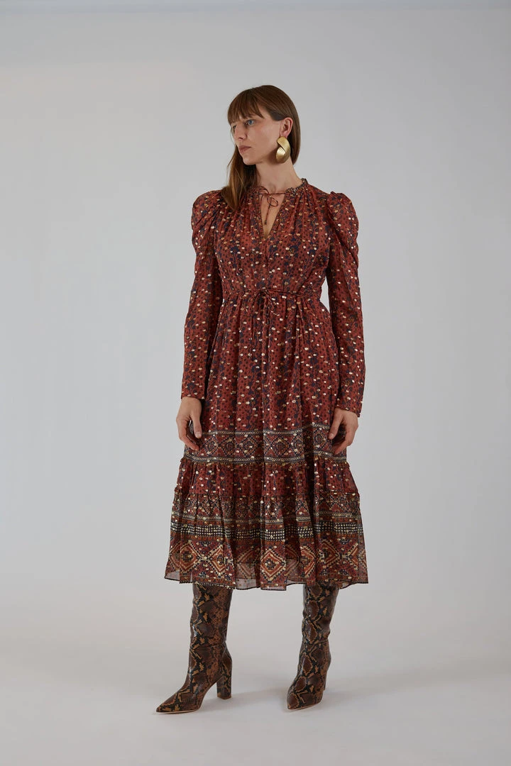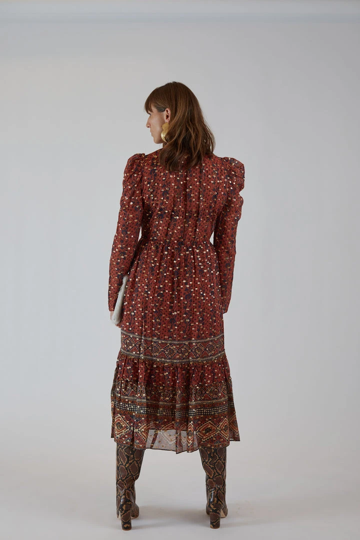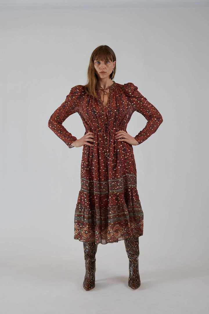 The Alessandra Dress is crafted from Indian floral printed dot lurex georgette in a rich brick color. Midi length style featuring split neckline, gathered shoulder details, and adjustable waist ties. Lined Skirt.Â