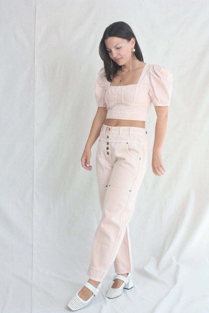 The denim August Pant is cut in a washed pink denim fabric. This jean pant is cut in a classic Ulla Johnson silhouette, high-waist with subtle peg legs and exaggerated topstitched seams throughout.