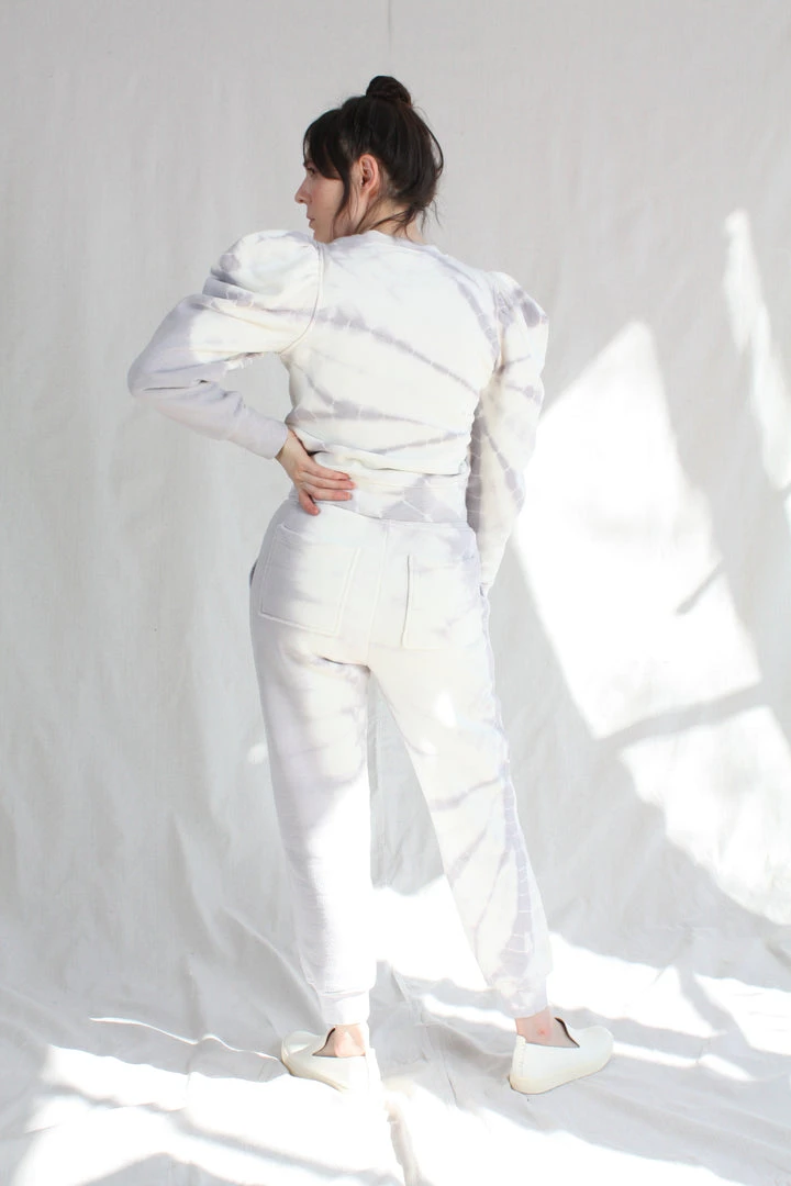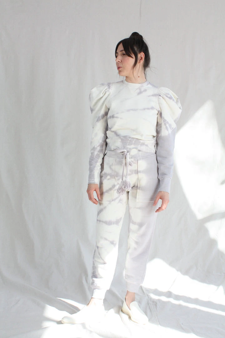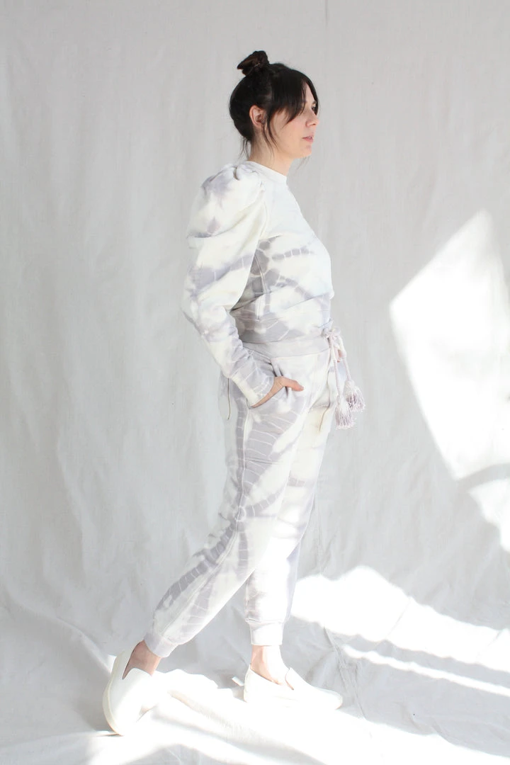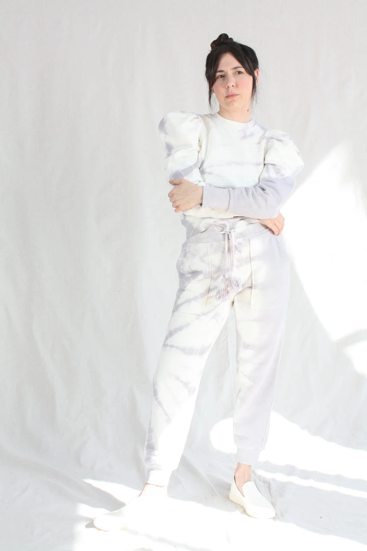 The Charley Pant is a casual silhouette in a light purple tie dye cotton fleece. Features a slightly tapered leg and elongated pockets, with oversize tassel adjustable waist tie.Â