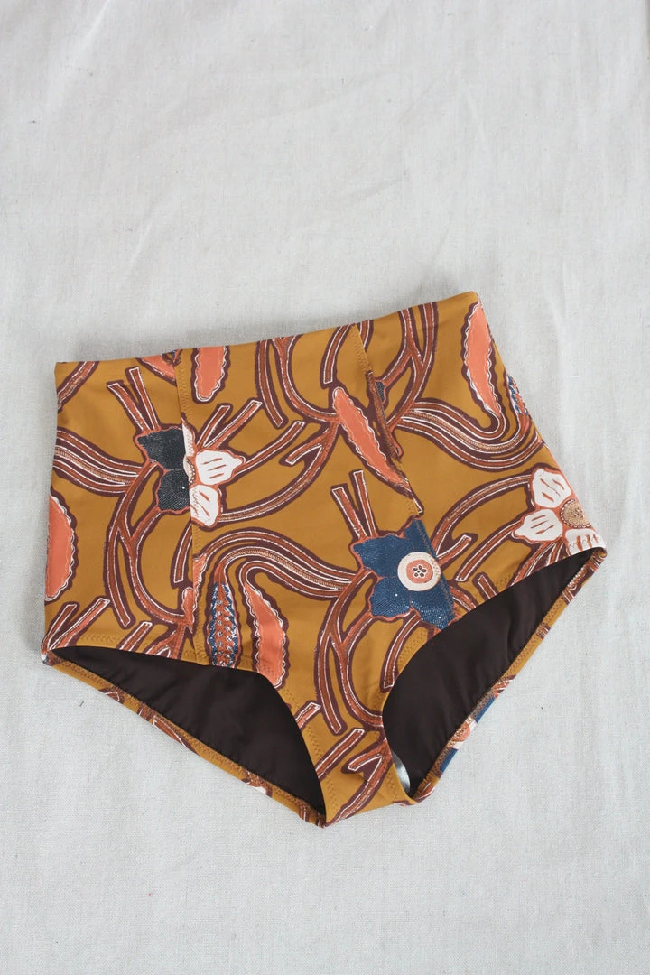 The Corsica Bikini Bottom is a full coverage swim bottom, designed with flattering princess seams along its front to shape the body along its contours. Features a high-waist and is printed in our trippy floral print in Citrine.Â