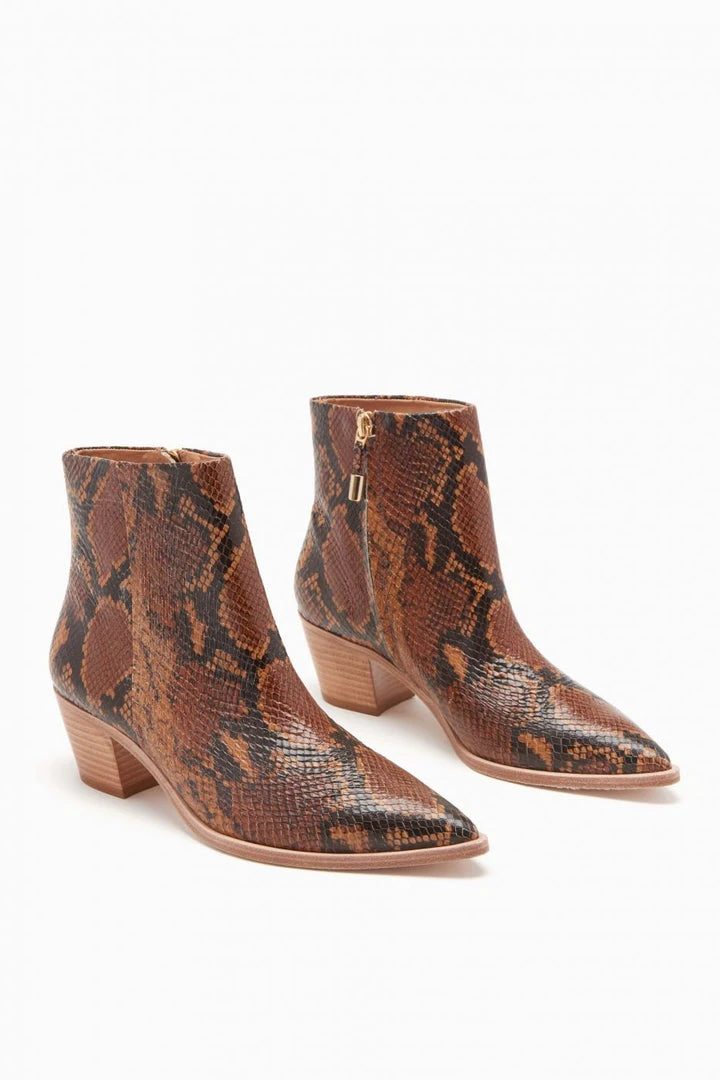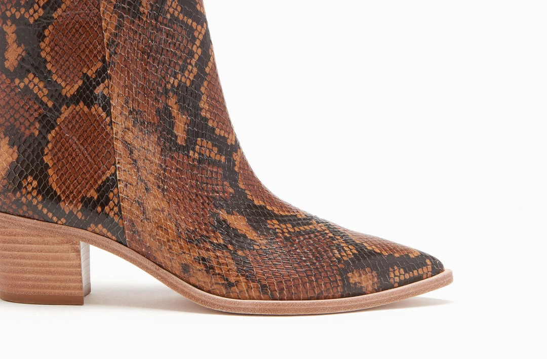 The Cruz Bootie in eye catching python embossed leather with wooden detailing. Features pointed toe and wooden block heel.