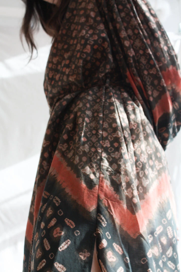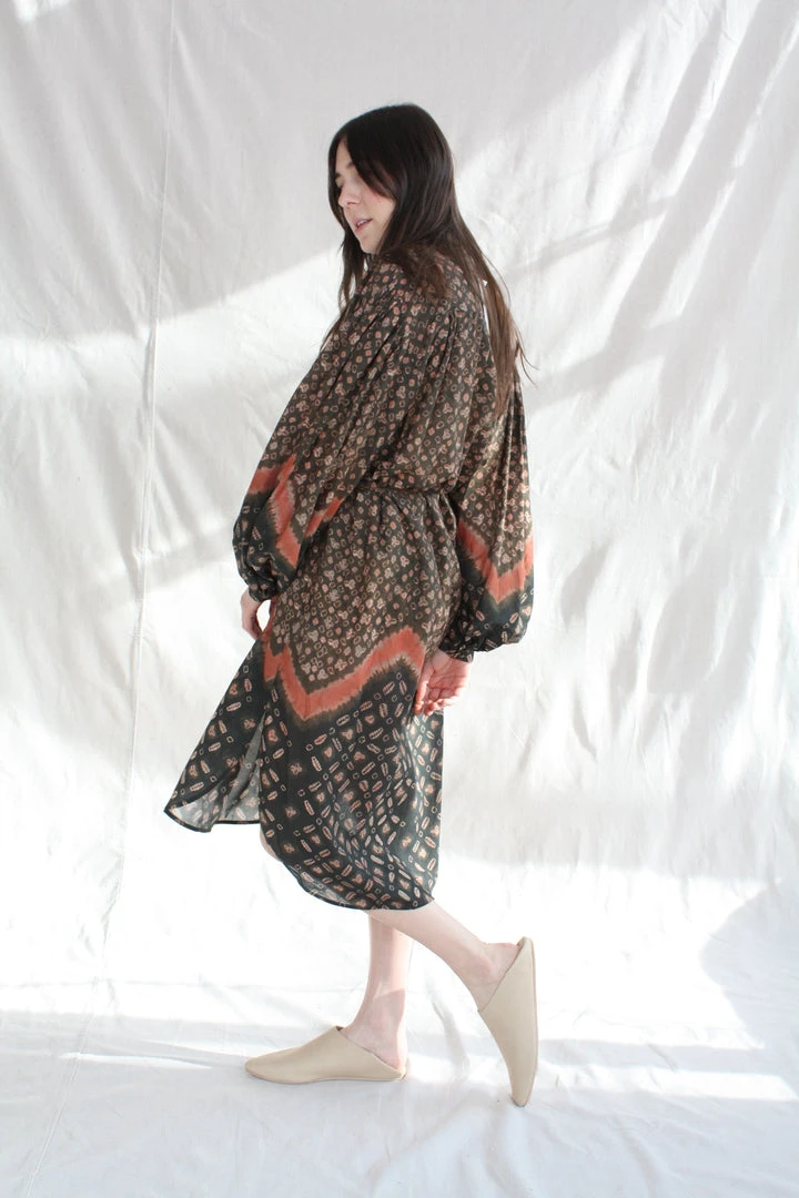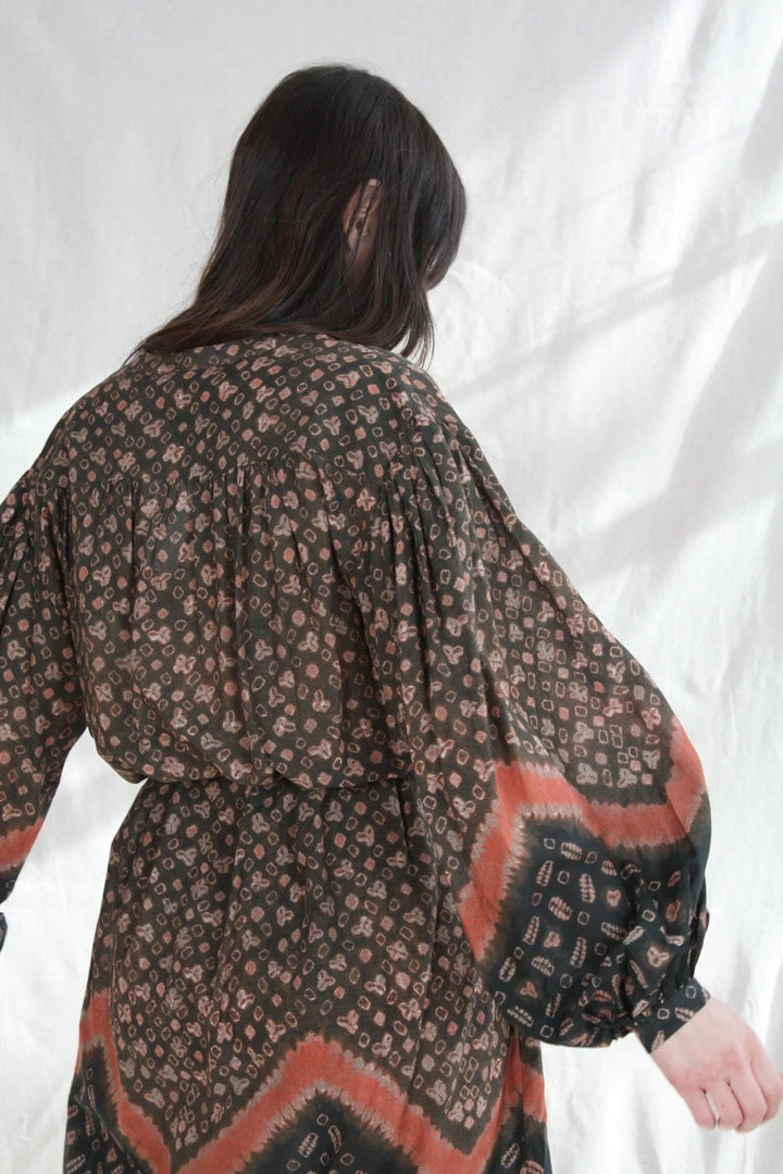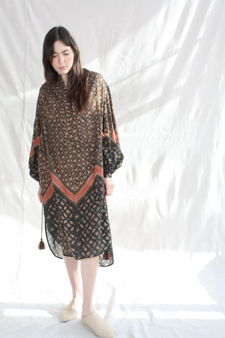 The Agadir Coverup is an easy silhouette, cut in a graphic chevron Shibori print in a lightweight cotton blend. This coverup doubles as a summer dress, with full voluminous sleeves and curved hem. Features a rope-style belt which can be removed to create a more open shape