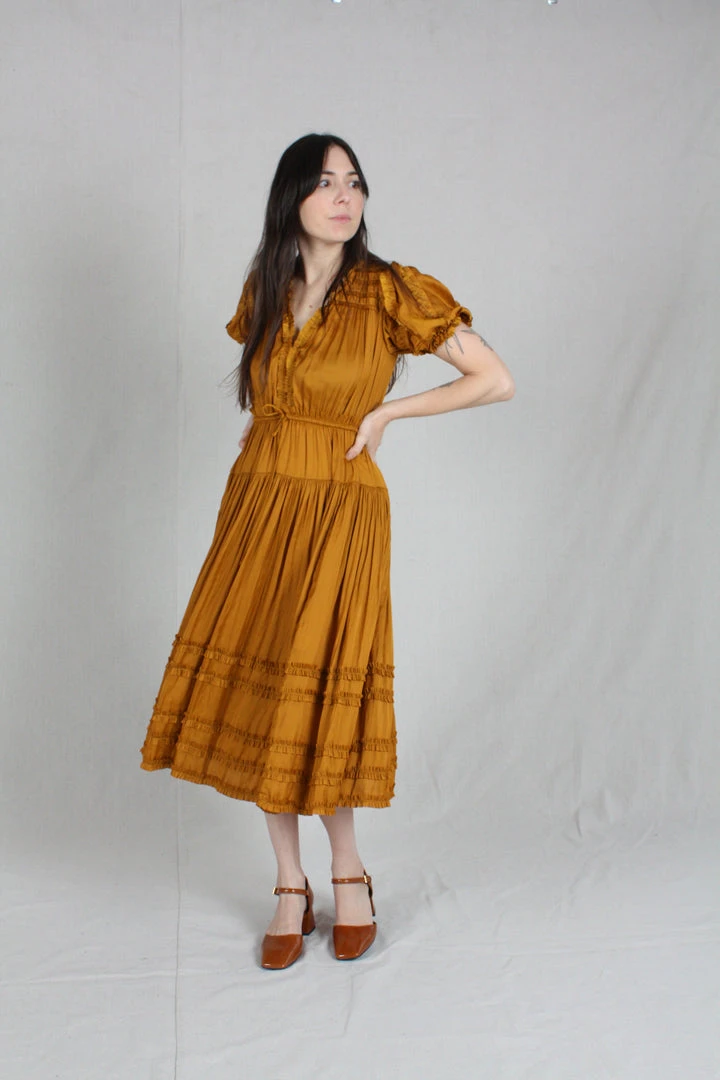 The Rose Dress is crafted in UJ’s seasonless plisse satin in Goldenrod. A plunging neckline is framed with double-edged ruffles, which enhance the dress throughout. Features a signature silhouette of puff sleeves finished with an elastic cuff, midi-length skirt and a side zip closure. This dress is unlined.