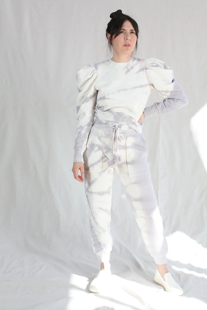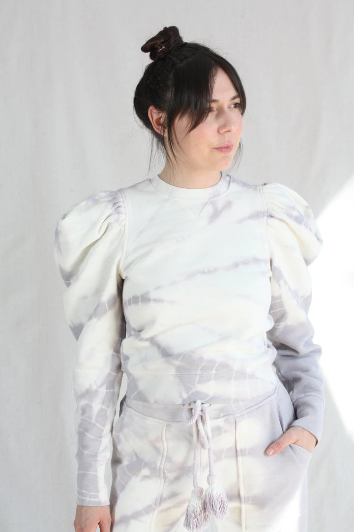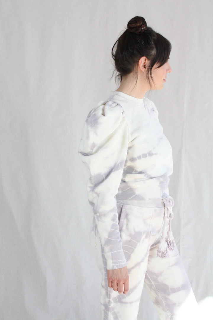 The Harlan Pullover is cut in lilac tie dye cotton fleece with draped sleeves that are gathered along the shoulder seam.