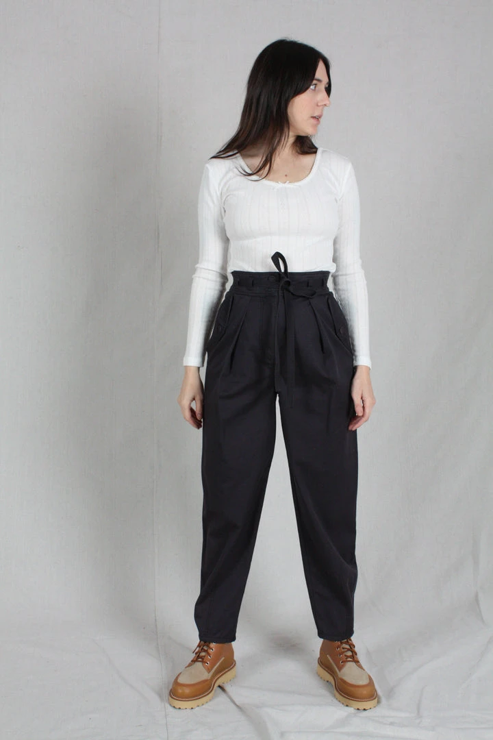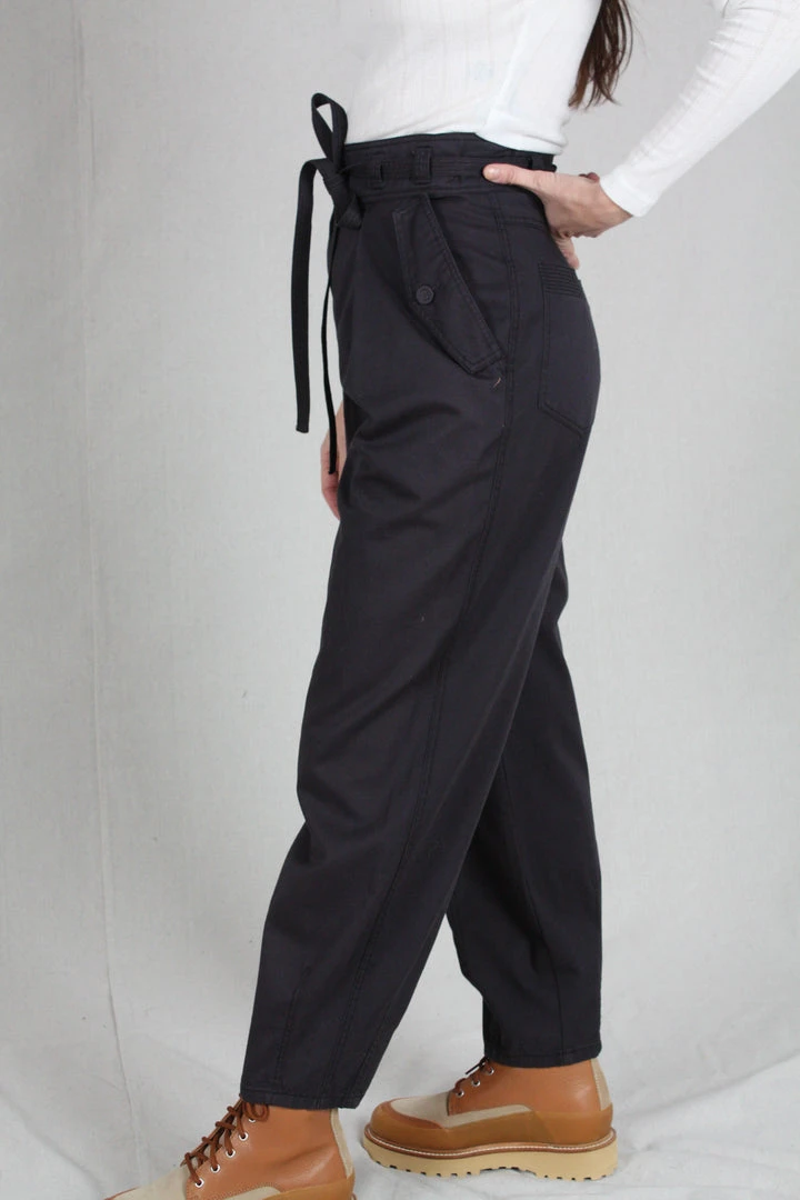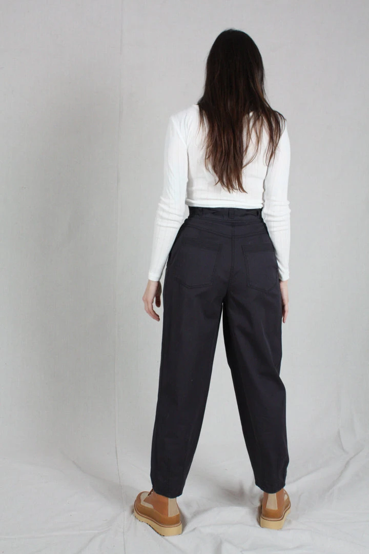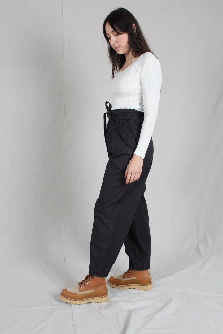 The Lars Pants is a tapered wide leg silhouette, in our dark slate cotton poplin. Features side seam flap pockets and tie closure down the center front.