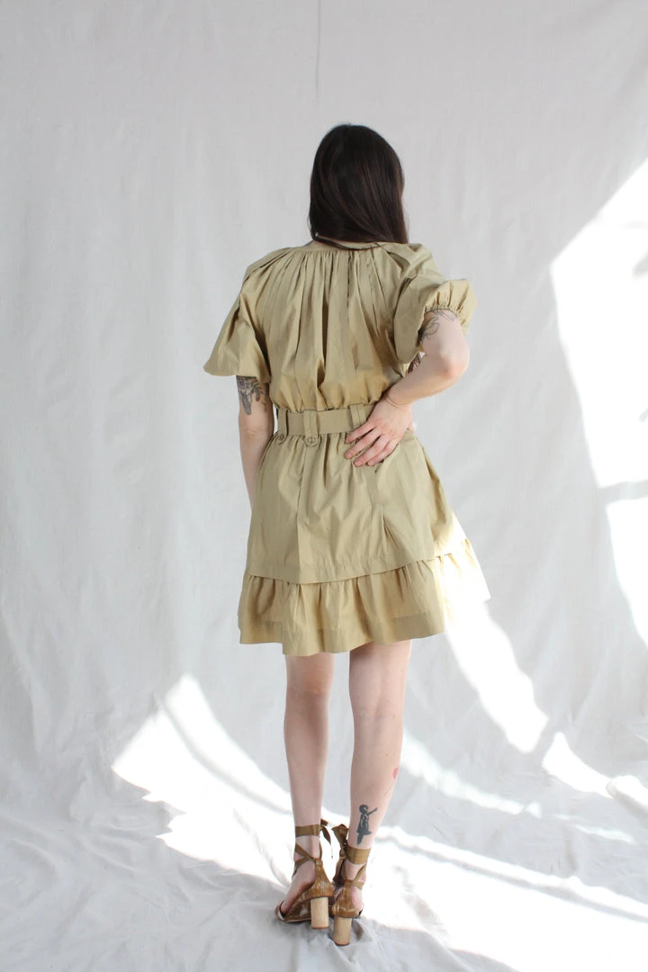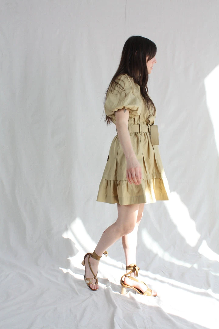 The Mica Dress melds playfulness with utilitarian design details in this mini silhouette. Reinforced seams create subtle tented volume along the skirt and puff sleeves, with tropunto stitching decorating the ties and removable belt. This dress is unlined.