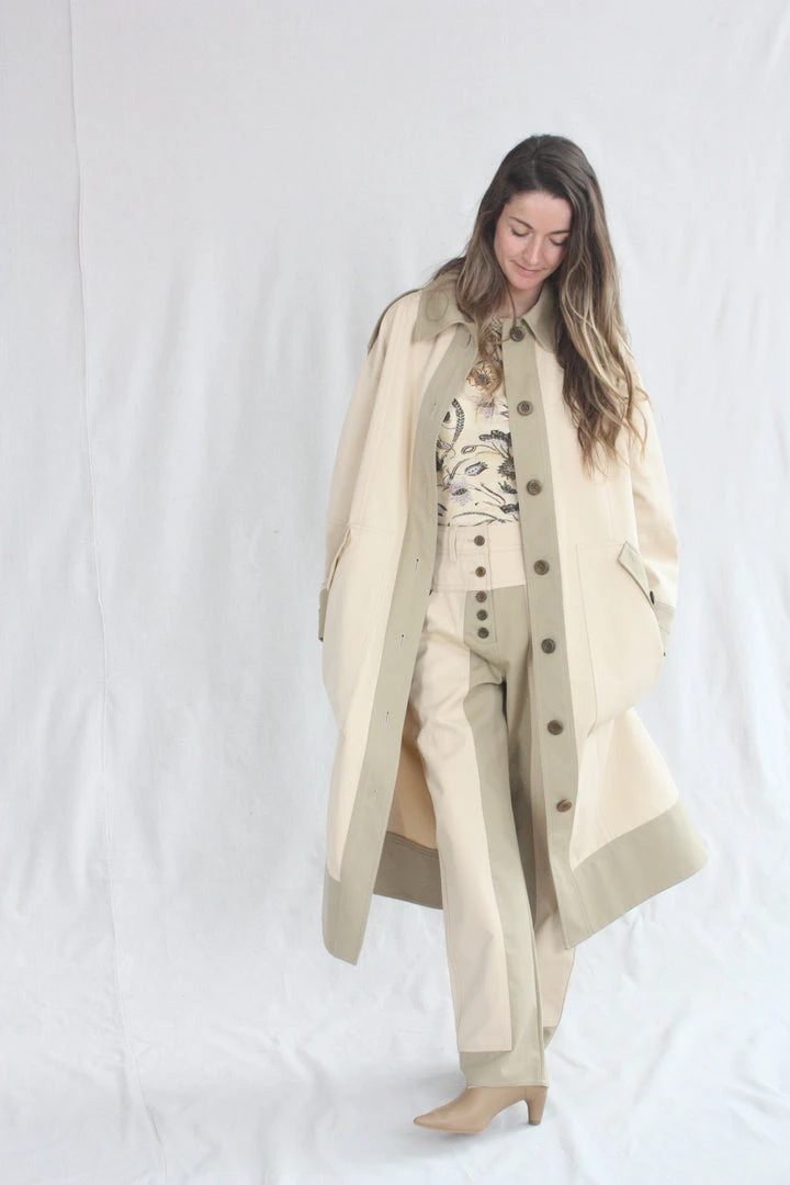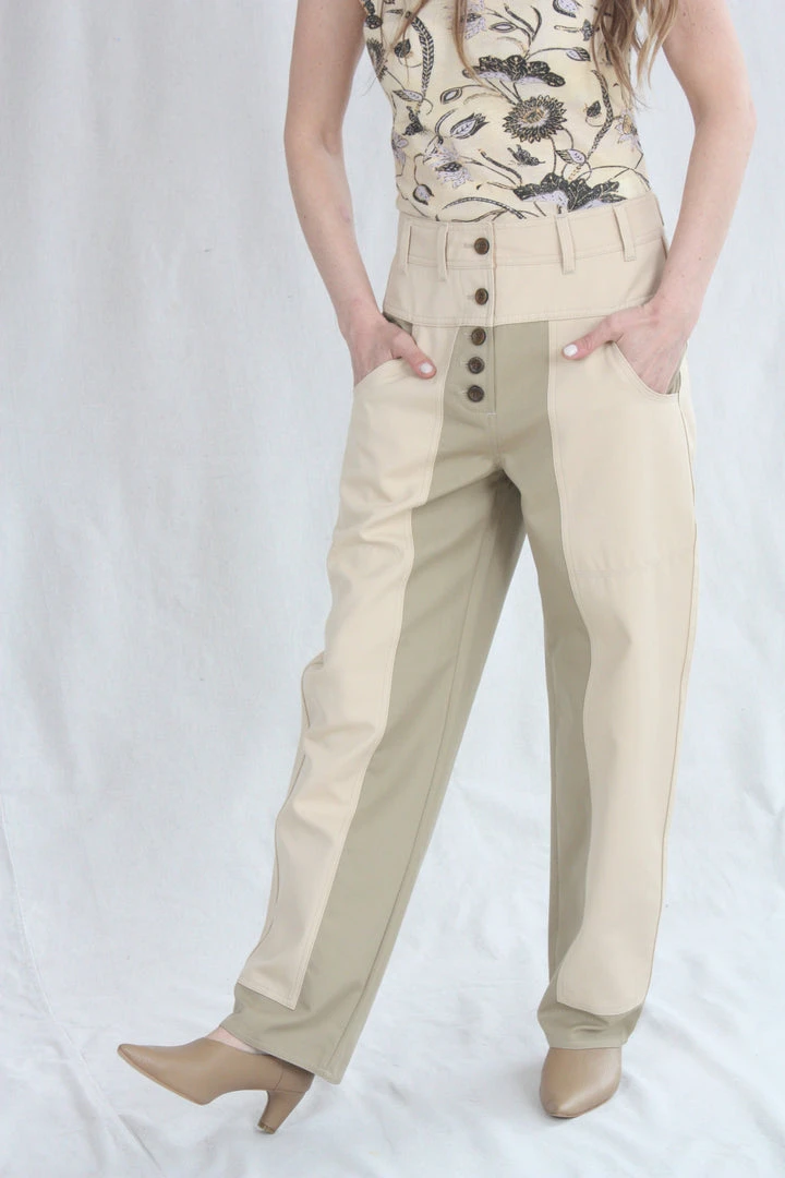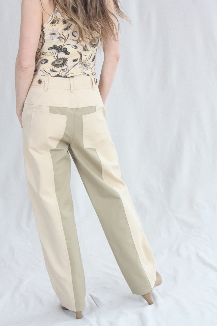 The August Pant is cut in Italian color block twill, using classic tailoring details to enhance the fit and overall design. This pant has a slightly tapered leg and reinforced seaming throughout to add to the utilitarian feel. Features exposed horn buttons at the center front.Â