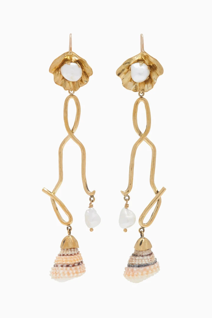 The Augustine Earring takes is inspiration from the sea, designed with a whimsical mélange of hand-hammered brass, pearls and seashells. Made with luxury gold-filled earwire, these earrings are hypoallergenic. Thoughtfully made through artisanal partners in Kenya, a long-standing relationship with Ulla Johnson that centers around craft and handwork. These earrings have a shoulder length drop.