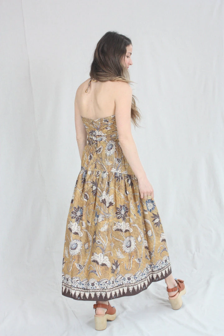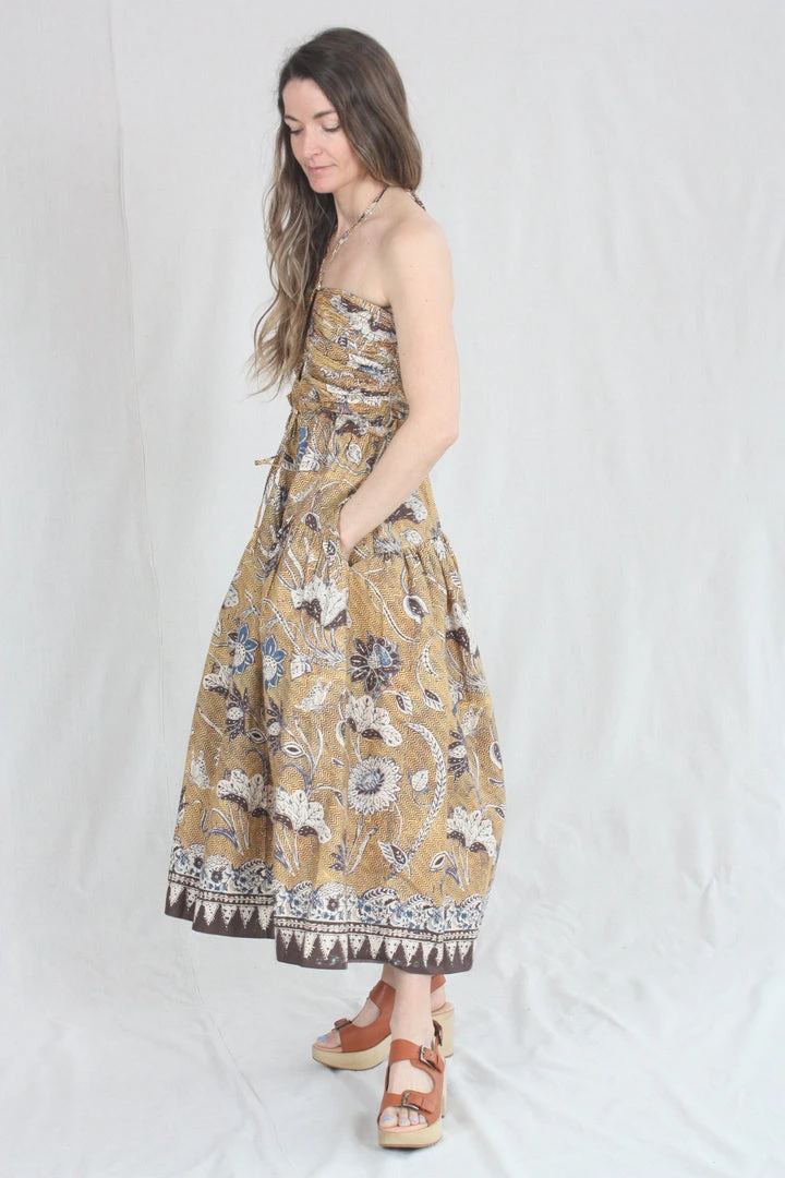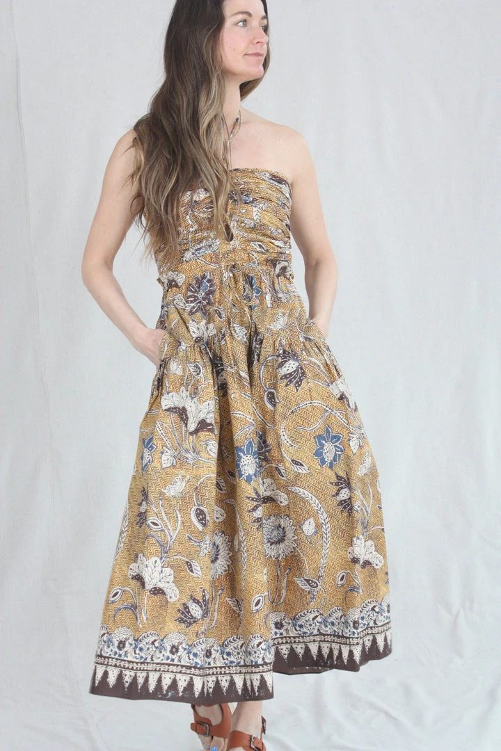 The Ella midi dress is inspired by body-skimming swimwear, designed with a ruched bodice featuring keyhole openings at its center. This corset-style top is balanced out by a full gathered skirt. This dress features a fixed waist, back zip closure and hidden side-seam pockets.