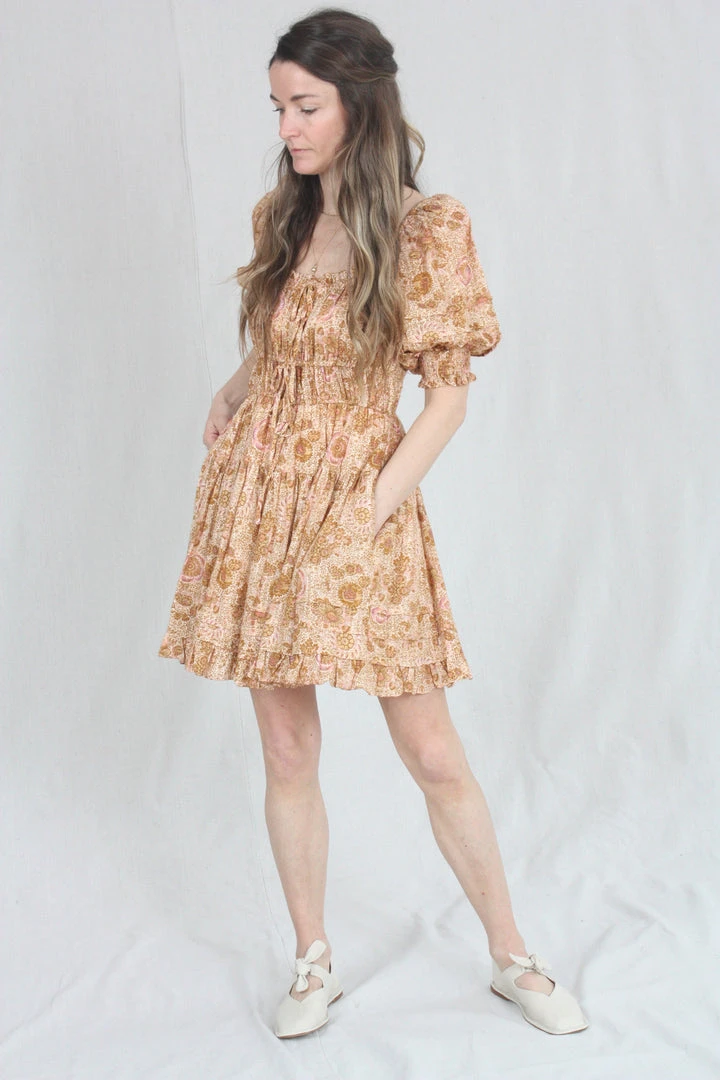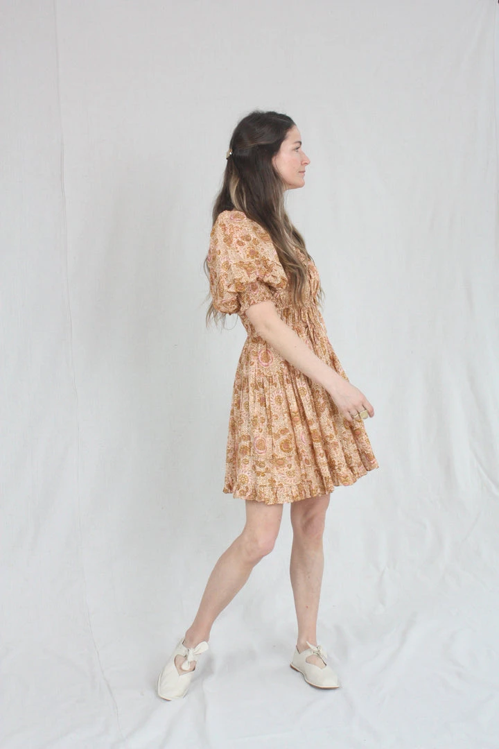 The Juniper mini dress is cut in the Jardin Des Fleurs cotton shadow stripe in hues of dusty rose and muted green against a cream background. This mini dress has elegant puff sleeves that are finished with elastic cuffs and is shirred through the bodice and topped with delicate ties throughout. The skirt is lined and finished with a gathered hem ruffle.
