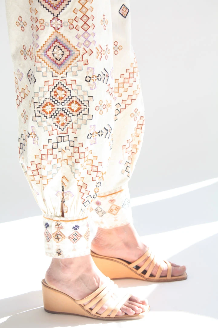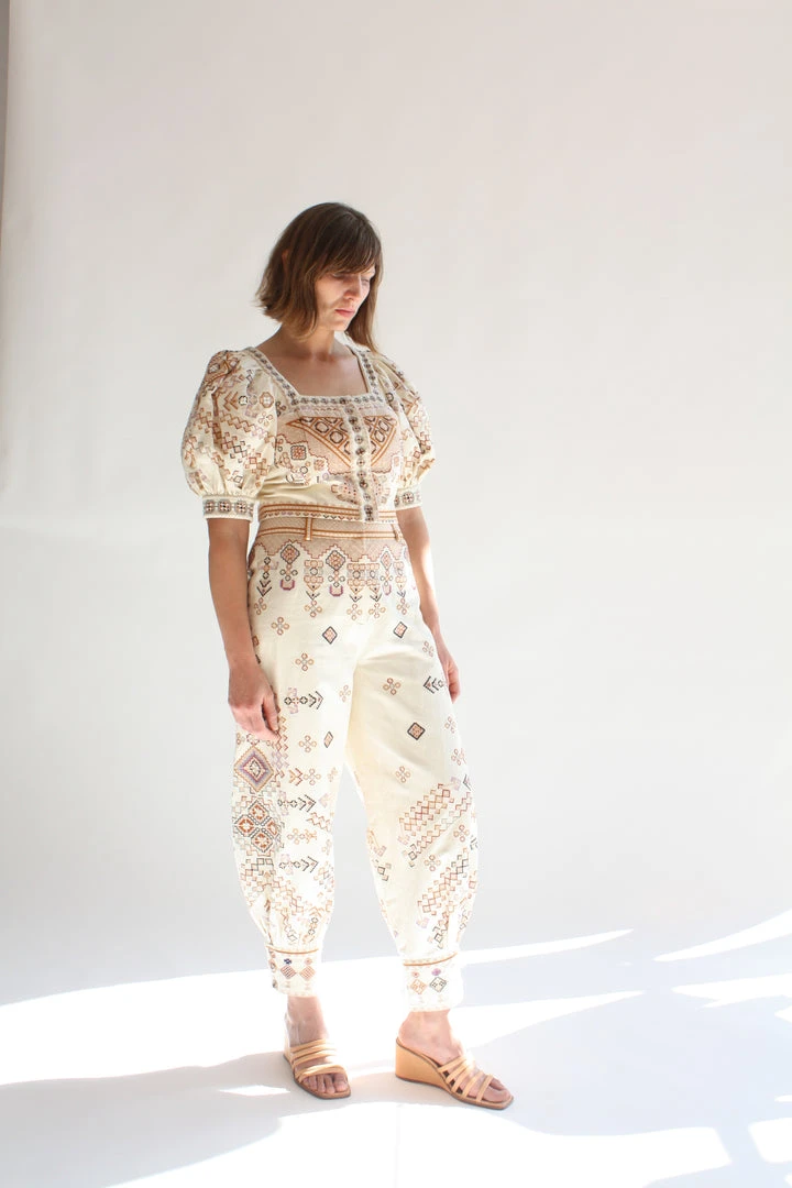 The Safa Pant is crafted from an intricately embroidered cotton twill fabrication. Ankle length style featuring voluminous legs and waistband button closure. Unlined.
