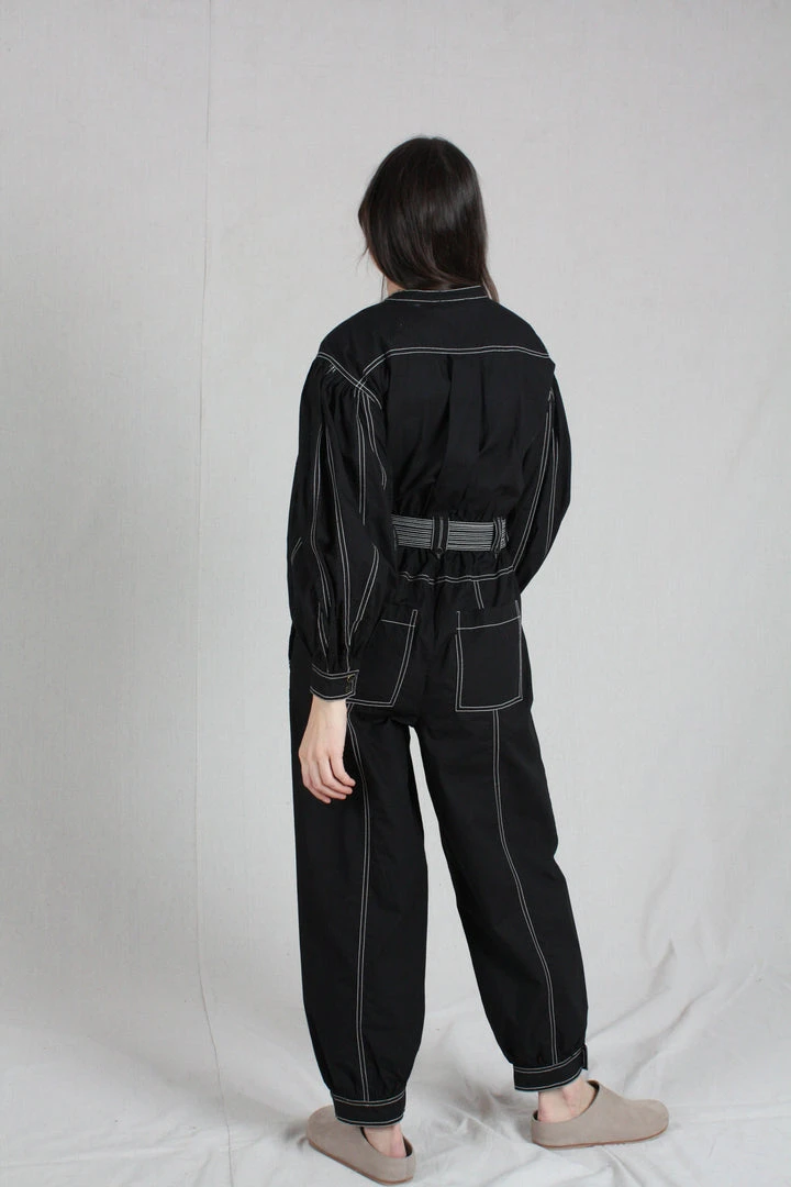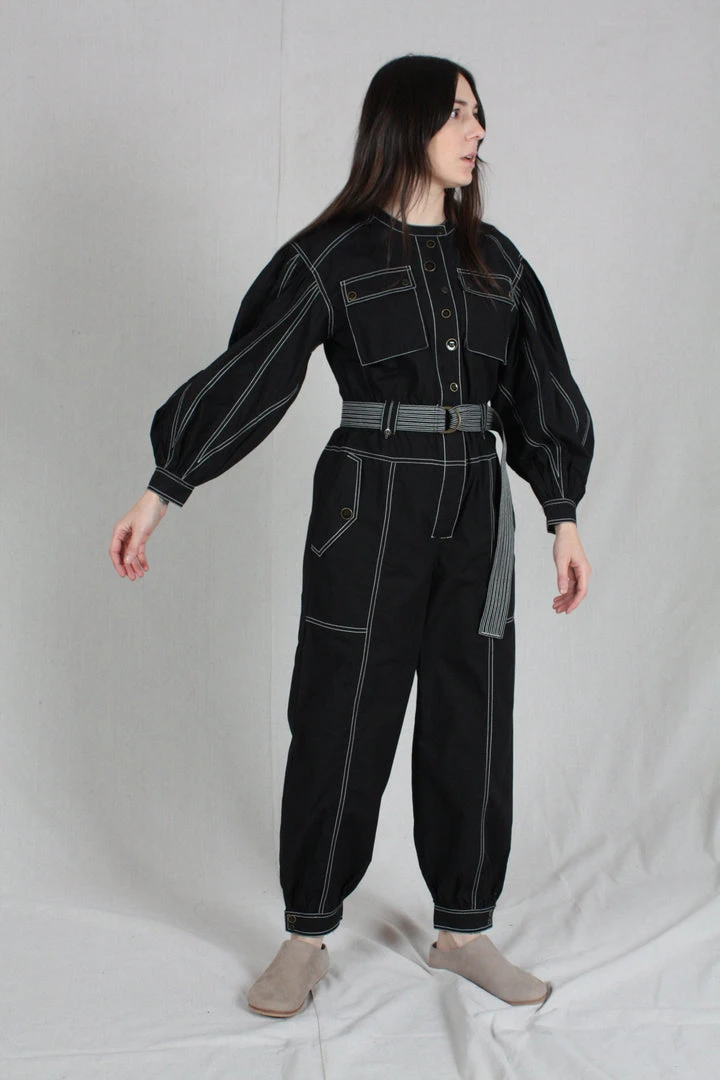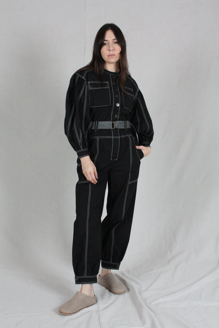 The Hattie Jumpsuit is cut in a military poplin and adorned with utilitarian details. This jumpsuit has a relaxed fit, with a removable belt atop an elastic waist and billowing sleeves finished with a buttoned cuff. Features a full buttoned placket down the center front.