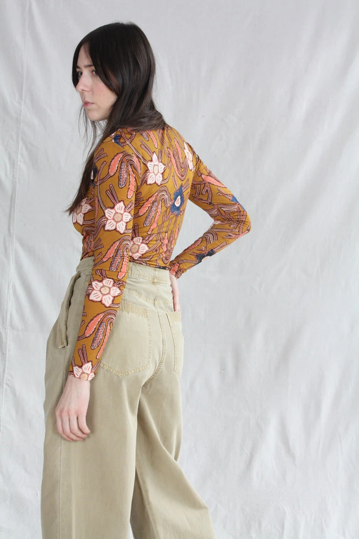 The Eve top in a bold floral print fo layering or standing out. This jersey top is meant to fit close to the body, with a crew neckline and full length sleeves.