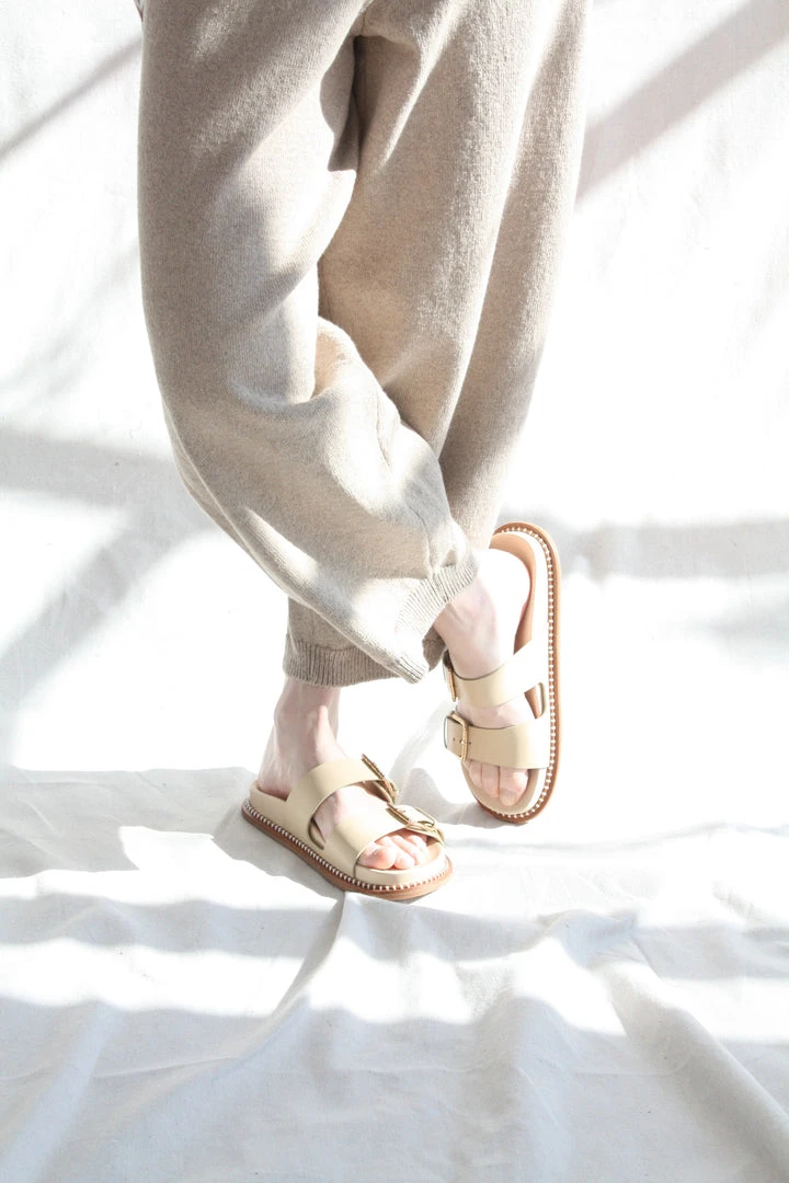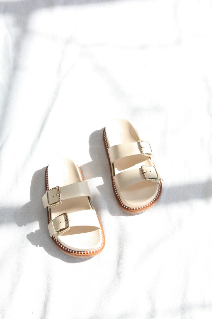 The Delamar Slide was designed for comfort and ease, with a shaped footbed and wide double buckle straps that create a sense of effortlessness. These slides are cut in beautiful vachetta leather and are finished with antique brass detailing.
