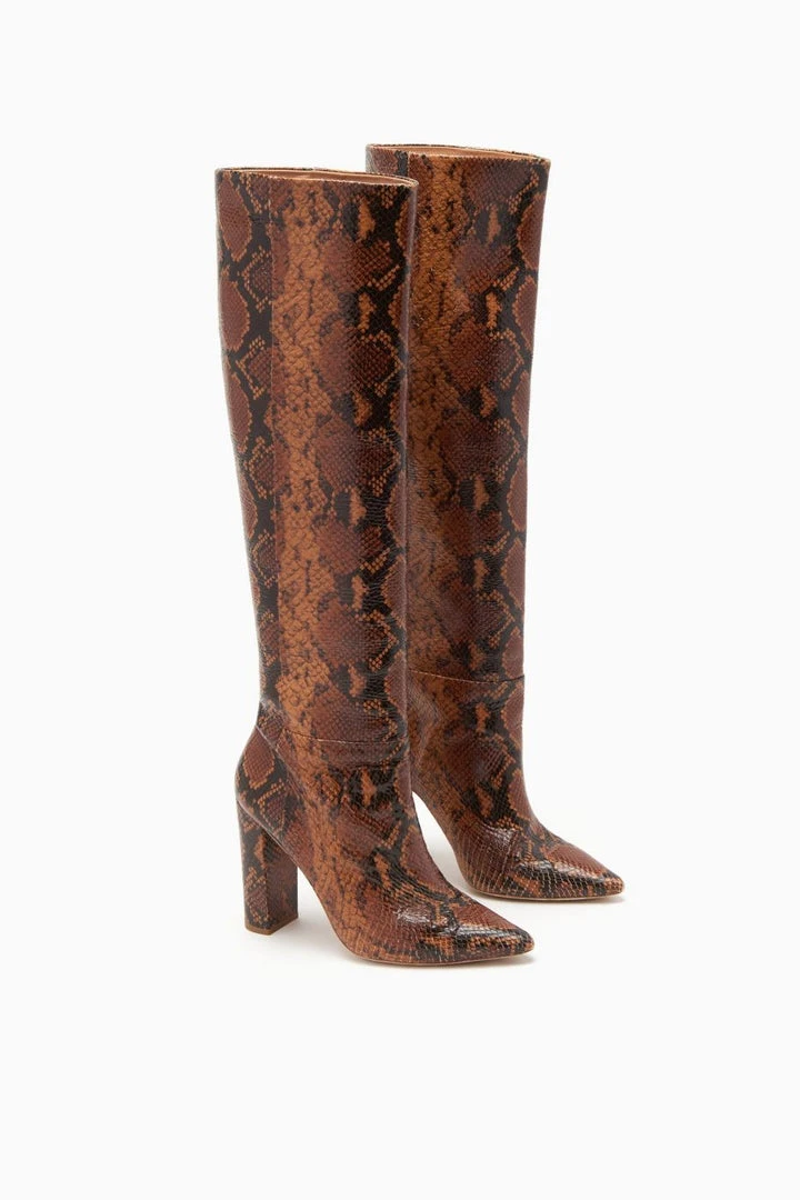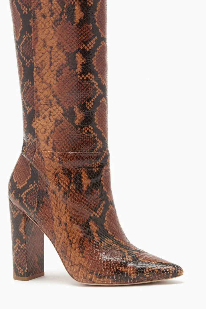 Knee high pull on style featuring a pointed toe and stacked heel.