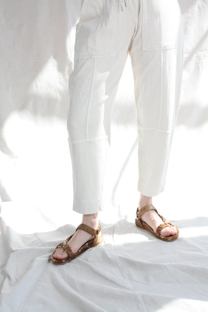 The Luca Sport Sandal is crafted in soft, hand-dyed nappa leather. Each an individual pattern of sage and moss. Adorned with antique-brass detailing and a molded foot bed with nappa leather encased elastic.