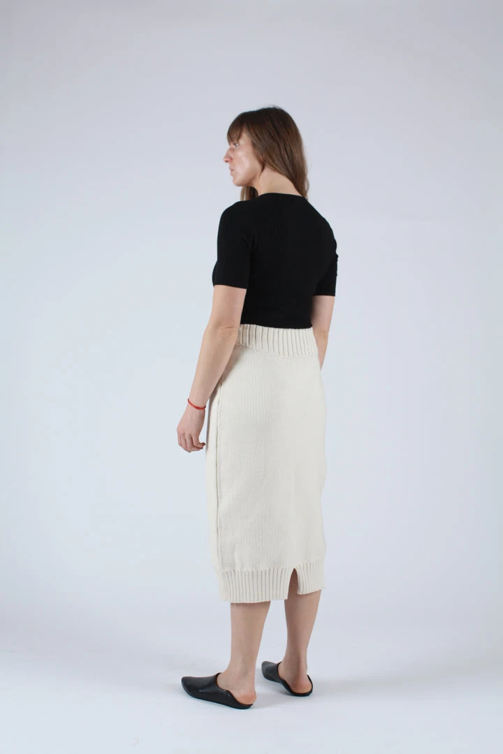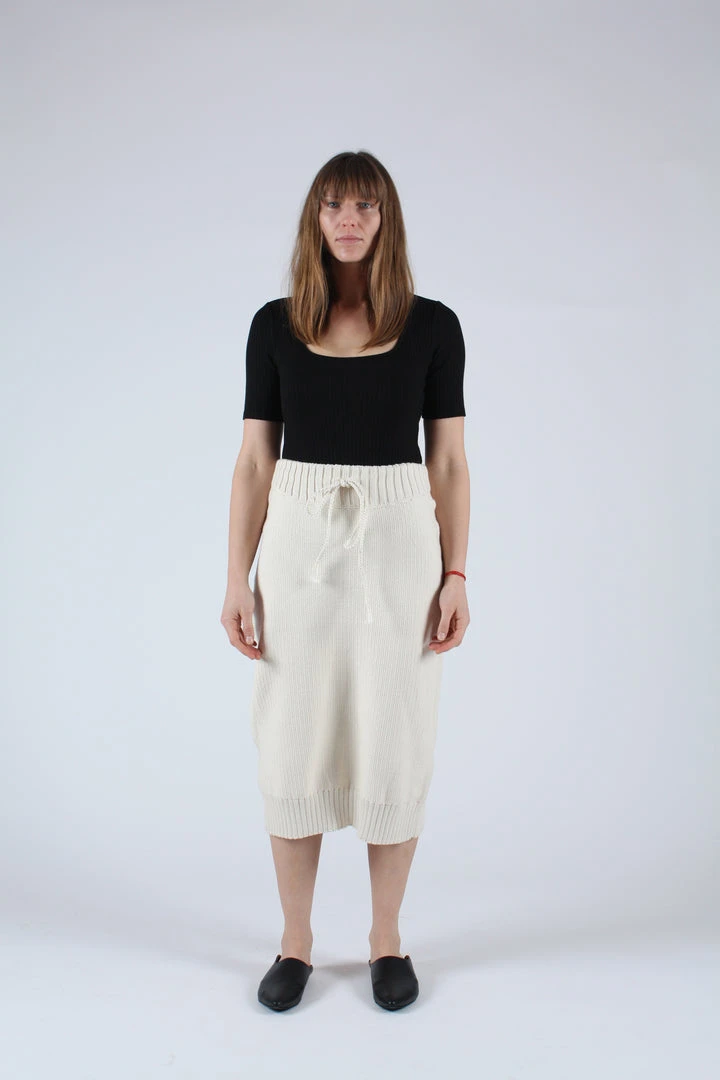 Textured skirt with a slight cocoon shape and rib bottom that hits below the knee. Curved rib waist with crochet tie.