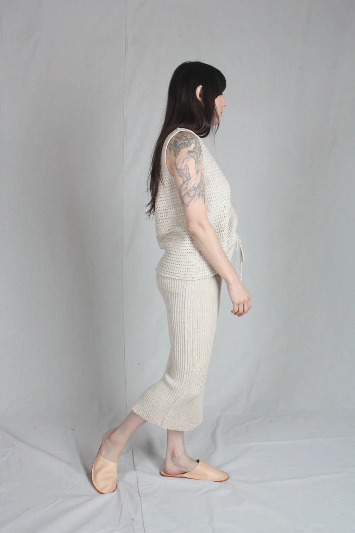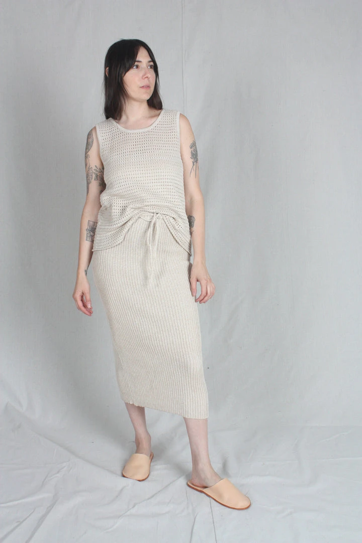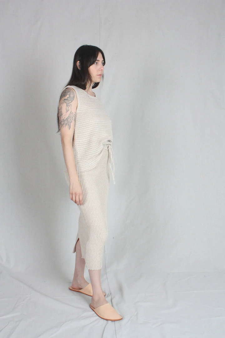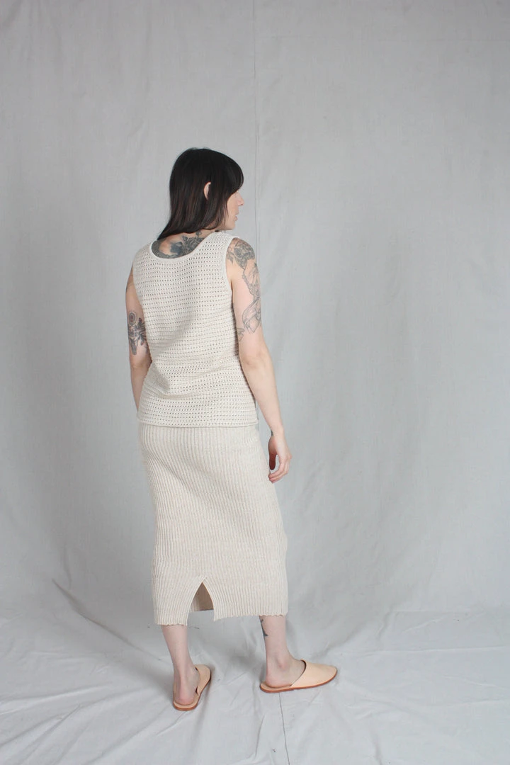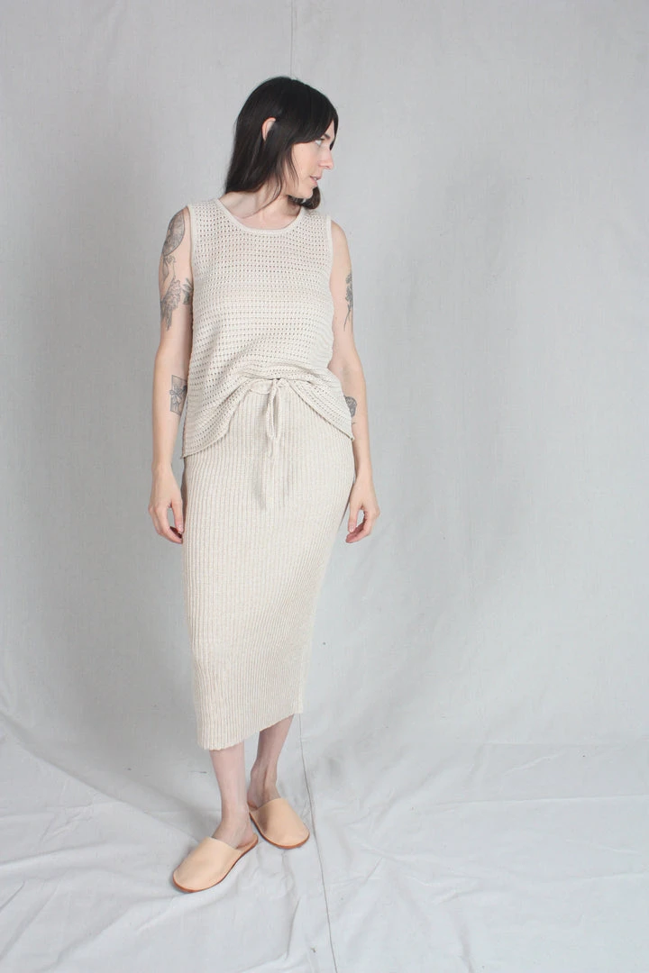 Tube skirt in a rib stitch with a center back slit, crochet tie and elastic waist. In a medium gauge knit, it hugs but isn’t sheer.