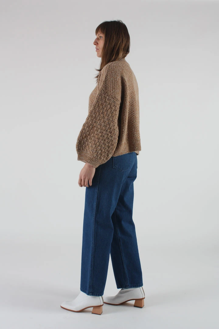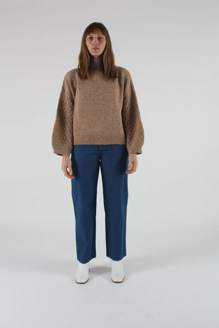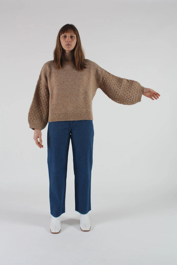 Oversized sweater with a wide rib turtleneck, textured stitch. A lace stitch on the tulip shaped sleeves. This yarn is a bulky Alpaca yarn mixed with a brushed yarn creating a fuzzy color mixing.