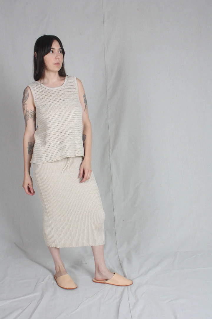 Easy fitting tank with a slight a-line and all over crochet like mesh stitch. This is a mid gauge knit but feels breezy because of the stitch.