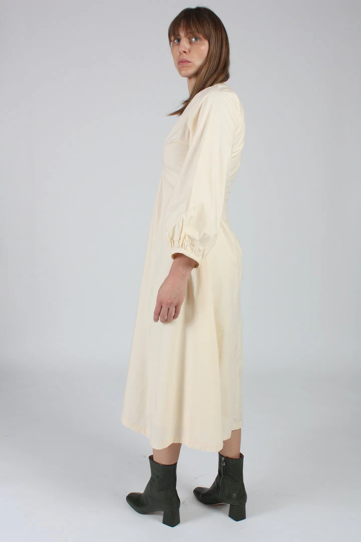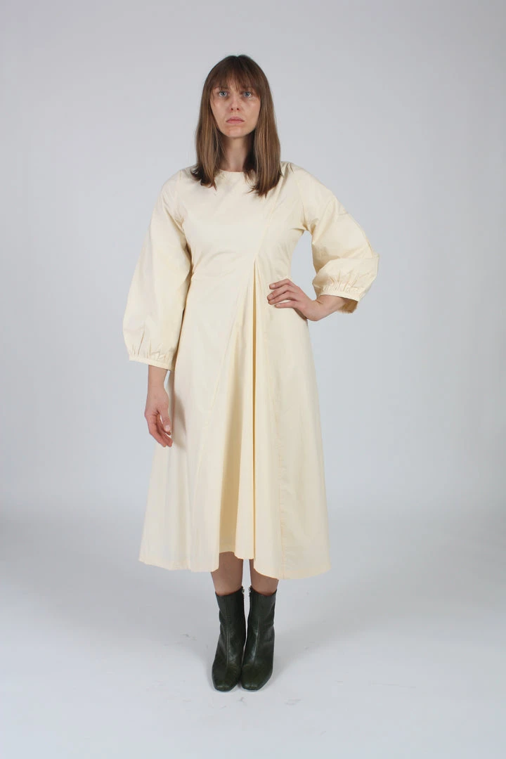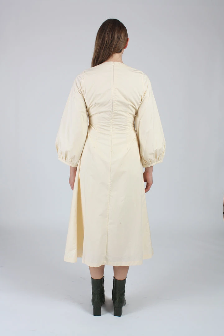 An elegant midi-length dress with bias cut and subtle balloon sleeves in a beautiful ivory cotton poplin. Lined and hidden back zip closure.