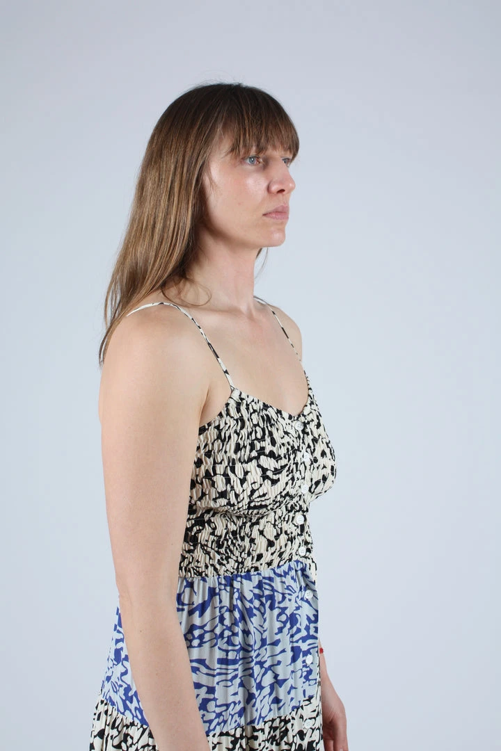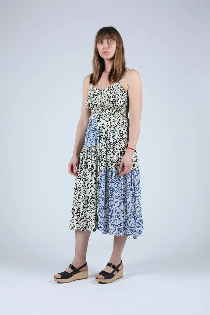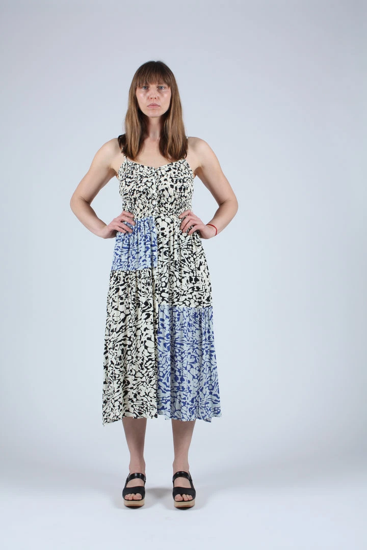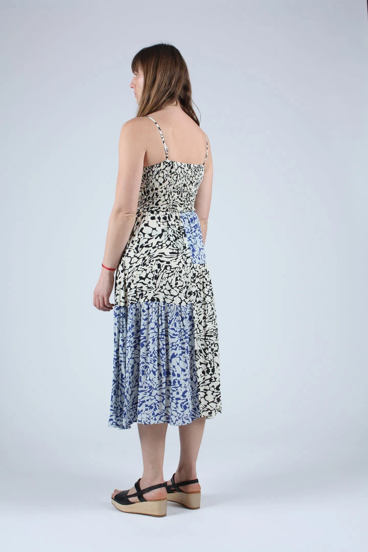 A smocked bodice dress with spaghetti straps and a full midi skirt. Features a patched body in both our tonal blue and graphic black and white abstract animal print.