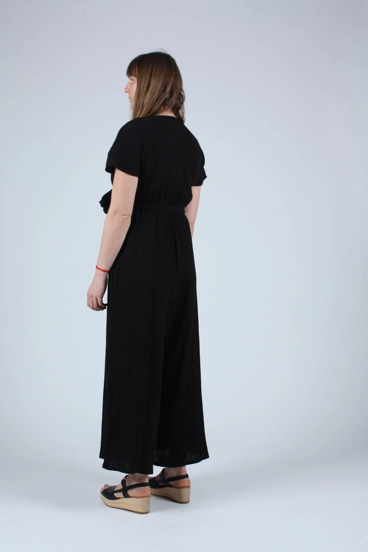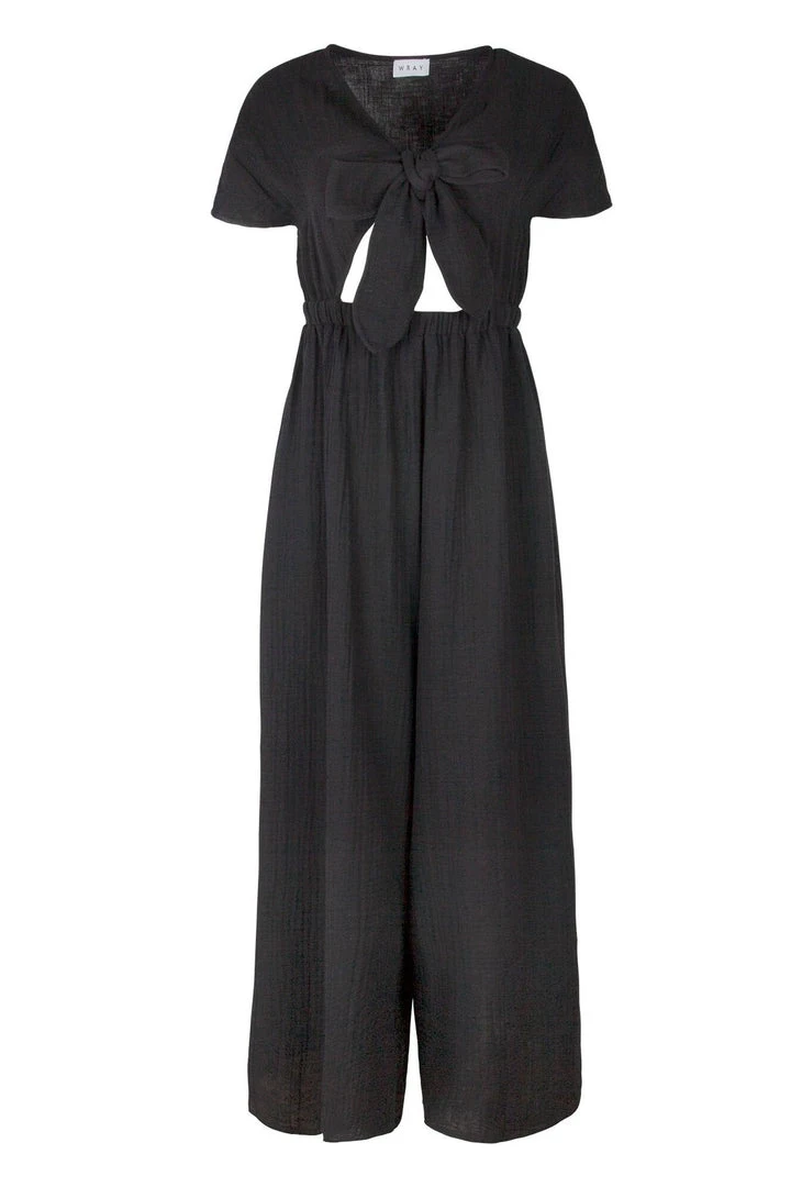 An effortless, relaxed black jumpsuit in super soft black cotton gauze. Features a comfortable elastic waist, tie front bust, cut out detail and side seam pockets.