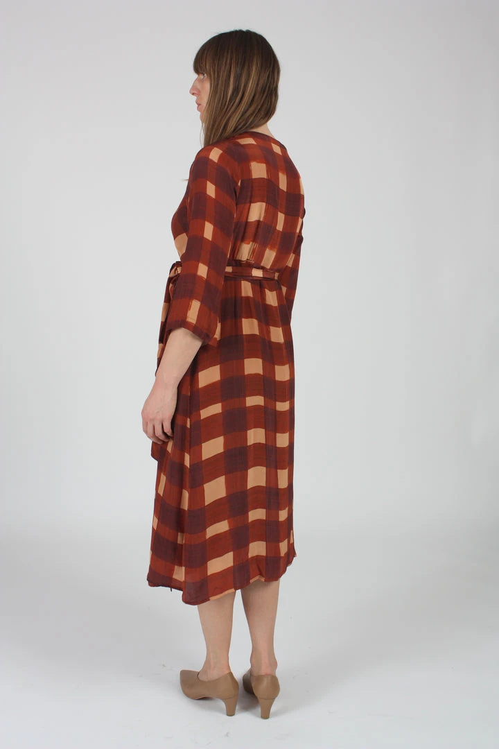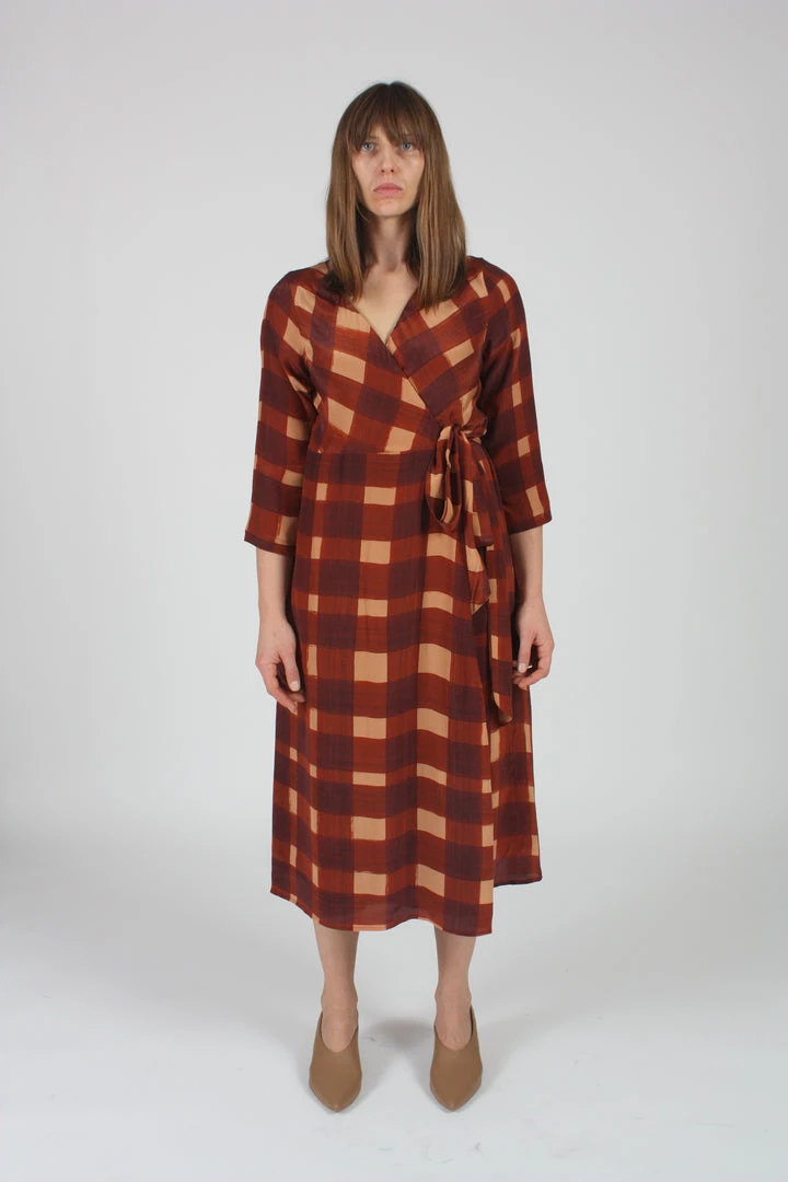 A classic wrap dress with a 3/4 sleeve, midi-length hemline and adjustable wrap-around closure. Featured in a beautiful hand-painted plaid. Lined.